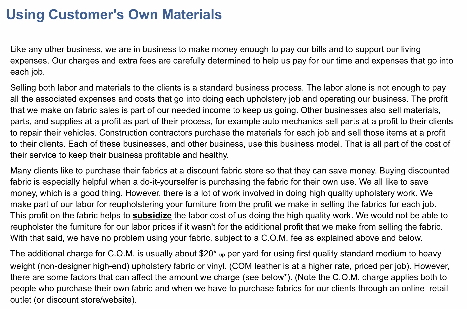 **Additional Costs for Pattern Matching Fabric, Tufting, Replacing foam padding or structural
